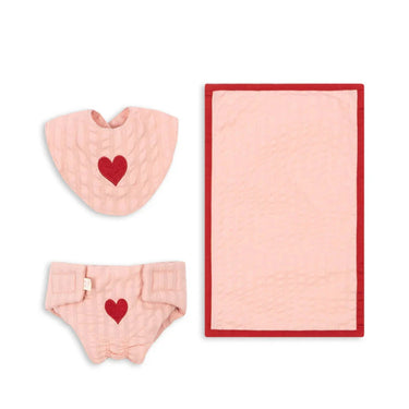 Puppeneltern aufgepasst! Mit dem Wickelset von Konges Sløjd kannst du ganz einfach und schnell deine Puppen gut versorgen . In dem Puppenwickelset ist ein Lätzchen, eine Windel mit Klettverschluss und ein Mulltuch für die Puppe aus 100 Prozent Bio-Baumwolle enthalten.