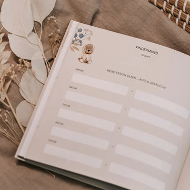 - Themen: Fuß- und Handabdruck, Lieblingslieder, Schlafpositionen, Geburtsdaten, erster Geburtstag, Taufe, erster Urlaub