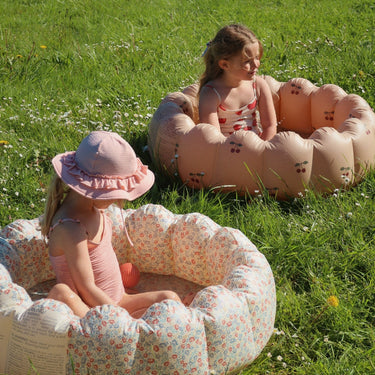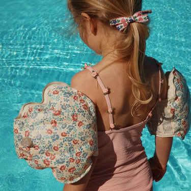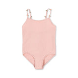 Badeanzug für Kinder aus einem weichen Seersucker Stoff. Verziert mit kleinen Rosen an den schmalen Trägern.