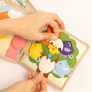 Ein handgemachtes Montessori-Buch, das spielerisch Wahrnehmung und Motorik fördert