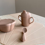 Das Muschelset hat eine auslaufsichere Schüssel mit weichen Klappen für einfaches und spielerisches Rausnehmen von Bananen, Keksen, Nudeln und vielem mehr. Spontanes Umdrehen, Runterwerfen oder Mitnehmen können Eltern jetzt entspannt entgegentreten. Der Becher mit zwei Henkeln unterstützt das selbstständige Trinken und kann auch ohne Deckel verwendet werden. Der passende Löffel ist nach den Bedürfnissen von kleinen Händen designt.