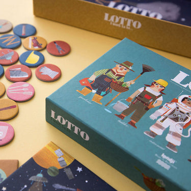 Ein Lottospiel mit verschiedenen Berufen zum Spielen mit der ganzen Familie. Enthält sechsunddreißig Token und sechs recycelte Spielbretter. Ein nachhaltiges Spielzeug ohne Geschlechterklischees