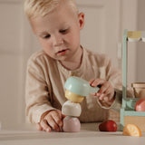 Der Eisstand von Little Dutch mit seiner niedlichen gelb-weißen Markise lädt kleine Verkäufer dazu ein, sechs verschiedene Eissorten und bunte Toppings zu kombinieren. Mit Waffeln und einer Preisliste ausgestattet, können Kinder fantasievolle Rollenspiele erleben, ihre eigenen Eis-Kreationen zusammenstellen und Kunden bedienen. Ein liebevoll gestaltetes Holzspielzeug für stundenlangen Spielspaß!