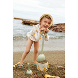 Der Seersucker Sille Schwimm-Jumpsuit aus recyceltem Polyester mit langen Ärmeln und Rüschen an den Schultern und der Taille ist perfekt, um sicher in der Sonne zu spielen.