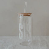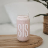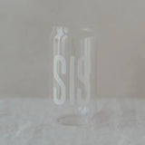 Hohes Trinkgläser mit weißem SIS Aufdruck an der Glaswand. Das Glas hat die Form einer Dose. Mit minimalistischen Design. Die Dosenform zusammen mit dem weißen Print machen die Gläser zu absoluten Hinguckern.