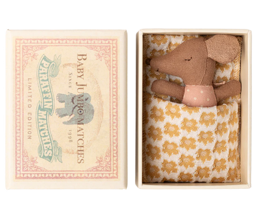 Es trägt einen kleinen Strampler. Friedlich schlummert die kleine Maileg Maus in ihrer Streichholzschachtel.