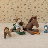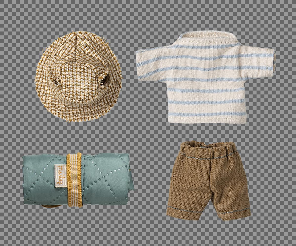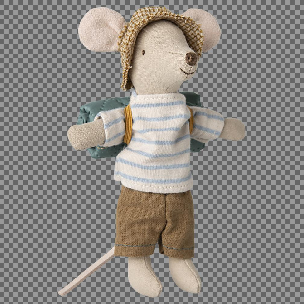 Diese Maus ist bestens vorbereitet für einen Wanderausflug in der wilden Natur. Sie ist tagelangunterwegs und bringt ihren eigenen Schlafsack für die Nächte unter den Sternen mit.