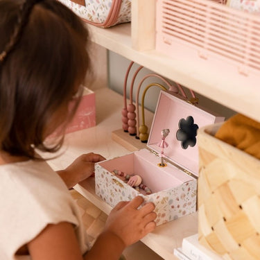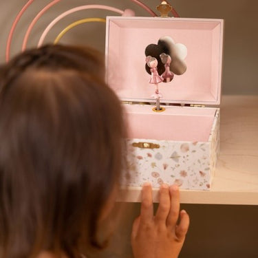 Dreh dich, kleine Rosa, dreh dich! In diesem schönen Schmuckkästchen möchte Ballerina Rosa ihre Pirouetten vorführen. Wenn du das Kästchen aufziehst, dreht sich Rosa zu lieblicher Musik. Dieses Kästchen ist perfekt, um Schmuck und kleine Souvenirs aufzubewahren. Das Schmuckkästchen ist mit unserem Blumen- und Schmetterlingsmotiv verziert, und im Inneren befindet sich ein kleiner Spiegel in Blumenform.