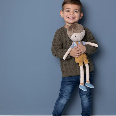 Die schicke und knuffige Kuschelpuppe Jim in seinem coolen Gartenanzug ist weich und toll zum Kuscheln. Jim kann aufrecht sitzen und begleitet Sie gerne im Holz Puppenbuggy von Little Dutch.