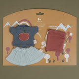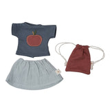 Dieses supersüße Outfit passt zu allen Fabelabs Fab Friends. Enthält 3 Teile: T-Shirt mit Apfel, Rock und Rucksack mit Kordelzug.
