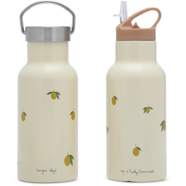 Hübsche Thermosflasche aus Edelstahl in Lebensmittelqualität von Konges Sløjd - ohne Strohhalm. Die Flasche ist eine ideale Reisebegleiterin, die kalte Getränke kalt und warme Getränke warmhält. Im Lieferumfang enthalten sind ein Deckel mit Tragemöglichkeit und ein Deckel mit Sportverschluss sowie ein Reiniger für die Flasche. Im Lieferumfang ist kein Strohhalm entahlten.