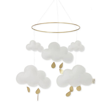 Mobile für Babys - Ein Klassiker und ein Muss für die ruhigsten Nächte und süßesten Träume. Das Wolkenmobile besteht aus gefilzten Wolken mit silber- oder goldfarbenen Tröpfchen. Die Wolken sind mit transparentem Faden befestigt. Qualität und Design von Konges Slojd.