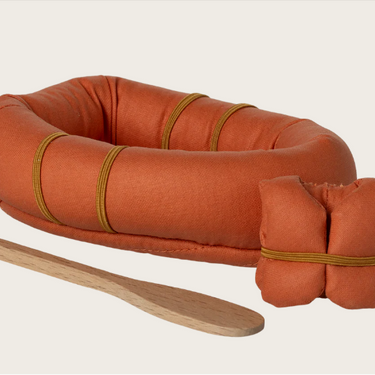 Dieses kleine Schlauchboot ist aus Stoff gefertigt und wird mit Schwimmweste und Paddel geliefert. Es ist nicht wasserdicht. Kombiniere es mit Wandermäusen und anderen Outdoor-Accessoires, um die Geschichte zu erweitern.